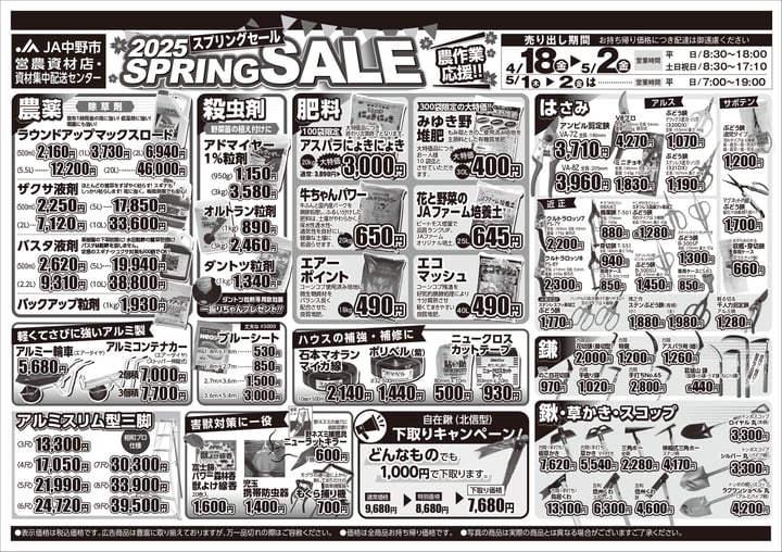 2025.04.18 ピックアップ セール 営農資材 営農資材店「2025 スプリングセール」開催! 営農資材店・資材集中配送センターにて、下記日程により「2025 スプリングセール」を開催いたします。 多くの商品がお求めやすくなっておりますので、セール期間中はぜひお越しください。 開催期間 4月18日(金)~5月2日(金) 平日 8:30 ~ 18:00 土日祝日 8:30 ~ 17:10 5/1~5/2 7:00 ~ 19:00 一覧に戻る
